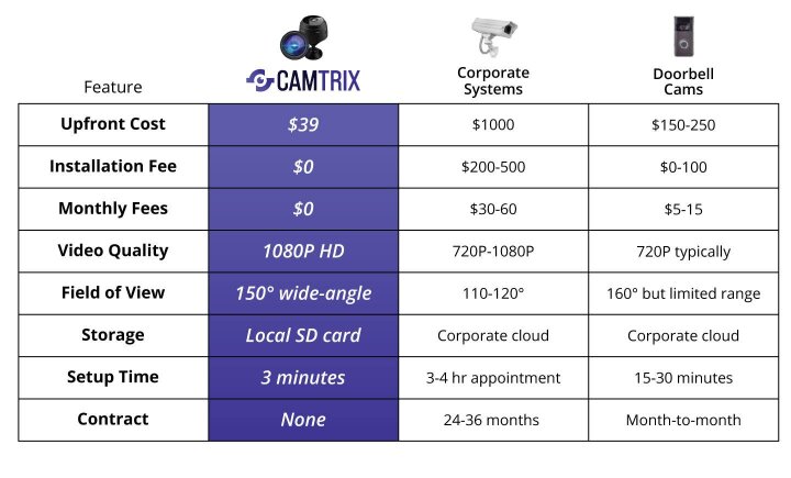 Summary: A tiny $60 camera is putting corporate security giants out of business – and they’re desperately trying to stop it… Every 4 minutes, someone’s home gets broken into in the US. That’s over 200,000 burglaries every single year. The worst part? Only 52% of victims even bother reporting it to police (down from 74% just a few years ago). Because burglars know exactly what to steal. Jewelry, cash, wallets, bikes, sporting equipment—the kinds of things that have no serial numbers, no proof of ownership, no way to trace. Without camera footage showing the break-in, there’s no evidence it even happened. Police can’t investigate what they can’t prove. Insurance companies deny claims without documentation. Police across New York, Los Angeles, and Austin are all saying the same thing: visible home security cameras are the only independent way to reduce burglary risks by up to 60%. But here’s where it gets REALLY frustrating… Here’s what they don’t advertise: corporate security companies make more money when crime rates go up. Think about it. The more burglaries hit the news, the more terrified homeowners call, begging for protection. The sales pitch? $1,000+ for equipment. Another $200-500 for “professional installation” (drilling some holes and plugging things in). Then the real moneymaker: 36-month contracts with $30-60 monthly fees. By the time, your contract expires? You’ve paid over $3,000 for a system that: Here’s the part that should make you angry: These companies have zero financial incentive to actually REDUCE crime in your area. CamTrix costs $60 and comes with built-in SD card. No monthly “ransom” to view recordings OF YOUR OWN HOME and $30-60 monthly subscription traps. Skip the $200-$500 installation fee scam. Stick CamTrix on any surface, connect the app, and protect your home in 3 minutes. Moving to a new house? Abandon the $2,000 system or pay hundreds (again) to have it uninstalled, reinstalled, and reactivated. CamTrix goes wherever you need it. While corporate cameras charge $400+ for basic 110° lenses, CamTrix delivers 150° ultra-wide coverage, advanced night vision up to 30 feet, smart motion detection, and 1080P HD quality—all for $60. Data breaches happen constantly. When corporate servers get hacked, strangers may access recordings of your home. CamTrix uses local SD card storage. Only YOU can watch it. 1080P HD Camera – Crystal-clear video quality day and night 150° Ultra-Wide Angle Lens – Panoramic coverage, zero blind spots Advanced Night Vision – Perfect clarity even in complete darkness Real-Time Mobile Alerts – Instant notifications straight to any phone MicroSD Card Slot – Local storage, complete privacy, no monthly fees Rechargeable Battery – Weeks of power per charge, no wires needed Magnetic Mount – Sticks anywhere in seconds, no drilling required Weatherproof – Works indoors and outdoors, any weather conditions iOS & Android Apps – Monitor from anywhere, easy controls Compact Design – Discreet size blends into any setting Step 1: Take CamTrix out of the box and use the magnetic mount to place it wherever protection is needed. Step 2: Download the free app by scanning the QR code, turn on the camera, and follow the simple connection prompts. Step 3: Start monitoring instantly—real-time alerts, HD footage, complete control from any smartphone ● Home Break-Ins: With over 200,000 break-ins annually in the US, homes without visible security are easy targets. The wide-angle lens covers entire entryways with no blind spots. Criminals look for easy opportunities—visible cameras make homes too risky to touch. ● Vandalism Evidence: Capture clear footage of anyone damaging property. License plates, faces, identifying clothing—evidence that leads to insurance claims and police reports. ● False Claims: Delivery drivers claiming they delivered when they didn’t. Neighbors saying a car hit theirs. CamTrix provides timestamped proof of exactly what happened. ● Rental Property Peace of Mind: For renters who can’t drill holes or run wiring, CamTrix provides proper security without risking their deposit. Remove it completely when moving—no damage, no questions. ● Monitoring While Away: Whether it’s a weekend at the coast or a month-long holiday, keep an eye on your property remotely. Check in anytime from anywhere. ● Elderly Care: Keep an eye on aging parents without invasive monitoring. Quick check-ins provide peace of mind that they’re okay without hovering. ● Watching Pets: Check on animals during work hours. Make sure they’re safe, not destroying furniture, or having medical emergencies while home alone. ● Holiday House Security: Get alerts if anyone’s snooping around while it sits empty for months. Corporate security companies spend billions on advertising campaigns, retail showrooms, and executive salaries. Customers pay for all of that through inflated prices and endless subscriptions. CamTrix sells direct online only. No retail markup. No salespeople. No installation crews. No massive ad budgets. Just the product. That allows them to cut prices by 95%. IMPORTANT: At the moment, CamTrix is offering a 75% OFF discount (making it at its LOWEST PRICE EVERY, $60). This is a standard direct-to-consumer strategy. Early buyers get the best deal while the brand builds credibility. Once they hit their review target, the discount ends and the price goes up to $99 (standard retail). Let’s compare prices: