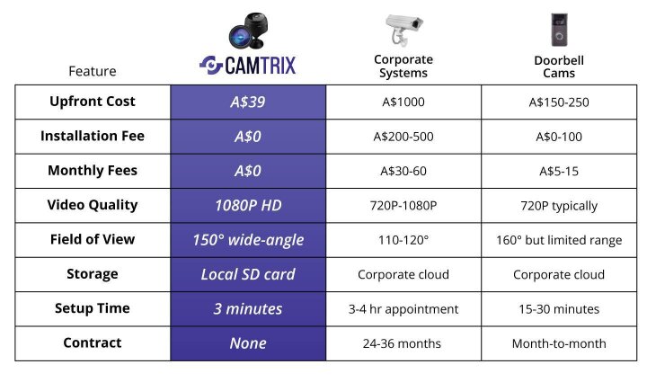 Summary: A tiny A$60 camera is putting corporate security giants out of business – and they’re desperately trying to stop it… Every 4 minutes, someone’s home gets broken into in the Australia. That’s over 200,000 burglaries every single year. The worst part? Only 52% of victims even bother reporting it to police (down from 74% just a few years ago). Because burglars know exactly what to steal. Jewellery, cash, wallets, bikes, sporting equipment—the kinds of things that have no serial numbers, no proof of ownership, no way to trace. Without camera footage showing the break-in, there’s no evidence it even happened. Police can’t investigate what they can’t prove. Insurance companies deny claims without documentation. Police across Melbourne, Sydney, Brisbane, and Perth are all saying the same thing: visible home security cameras are the only independent way to reduce burglary risks by up to 60%. But here’s where it gets REALLY frustrating… Here’s what they don’t advertise: corporate security companies make more money when crime rates go up. Think about it. The more burglaries hit the news, the more terrified homeowners call, begging for protection. The sales pitch? A$1,000+ for equipment. Another A$200-500 for “professional installation” (drilling some holes and plugging things in). Then the real moneymaker: 36-month contracts with A$30-60 monthly fees. By the time your contract expires? You’ve paid over A$3,000 for a system that: Here’s the part that should make you angry: These companies have zero financial incentive to actually REDUCE crime in your area. CamTrix costs A$60 and comes with built-in SD card. No monthly “ransom” to view recordings OF YOUR OWN HOME and A$30-60 monthly subscription traps. Skip the A$200-A$500 installation fee scam. Stick CamTrix on any surface, connect the app, and protect your home in 3 minutes. Moving to a new house? Abandon the A$2,000 system or pay hundreds (again) to have it uninstalled, reinstalled, and reactivated. CamTrix goes wherever you need it. While corporate cameras charge A$400+ for basic 110° lenses, CamTrix delivers 150° ultra-wide coverage, advanced night vision up to 30 feet, smart motion detection, and 1080P HD quality—all for A$60. Data breaches happen constantly. When corporate servers get hacked, strangers may access recordings of your home. CamTrix uses local SD card storage. Only YOU can watch it. 1080P HD Camera – Crystal-clear video quality day and night 150° Ultra-Wide Angle Lens – Panoramic coverage, zero blind spots Advanced Night Vision – Perfect clarity even in complete darkness Real-Time Mobile Alerts – Instant notifications straight to any phone MicroSD Card Slot – Local storage, complete privacy, no monthly fees Rechargeable Battery – Weeks of power per charge, no wires needed Magnetic Mount – Sticks anywhere in seconds, no drilling required Weatherproof – Works indoors and outdoors, any weather conditions iOS & Android Apps – Monitor from anywhere, easy controls Compact Design – Discreet size blends into any setting Step 1: Take CamTrix out of the box and use the magnetic mount to place it wherever protection is needed. Step 2: Download the free app by scanning the QR code, turn on the camera, and follow the simple connection prompts. Step 3: Start monitoring instantly—real-time alerts, HD footage, complete control from any smartphone ● Home Break-Ins: With over 200,000 break-ins annually in the Australia, homes without visible security are easy targets. The wide-angle lens covers entire entryways with no blind spots. Criminals look for easy opportunities—visible cameras make homes too risky to touch. ● Vandalism Evidence: Capture clear footage of anyone damaging property. License plates, faces, identifying clothing—evidence that leads to insurance claims and police reports. ● False Claims: Delivery drivers claiming they delivered when they didn’t. Neighbors saying a car hit theirs. CamTrix provides timestamped proof of exactly what happened. ● Rental Property Peace of Mind: For renters who can’t drill holes or run wiring, CamTrix provides proper security without risking their deposit. Remove it completely when moving—no damage, no questions. ● Monitoring While Away: Whether it’s a weekend at the coast or a month-long holiday, keep an eye on your property remotely. Check in anytime from anywhere. ● Elderly Care: Keep an eye on aging parents without invasive monitoring. Quick check-ins provide peace of mind that they’re okay without hovering. ● Watching Pets: Check on animals during work hours. Make sure they’re safe, not destroying furniture, or having medical emergencies while home alone. ● Holiday House Security: Get alerts if anyone’s snooping around while it sits empty for months. Corporate security companies spend billions on advertising campaigns, retail showrooms, and executive salaries. Customers pay for all of that through inflated prices and endless subscriptions. CamTrix sells direct online only. No retail markup. No salespeople. No installation crews. No massive ad budgets. Just the product. That allows them to cut prices by 95%. IMPORTANT: At the moment, CamTrix is offering a 75% OFF discount (making it at its LOWEST PRICE EVERY, A$60). This is a standard direct-to-consumer strategy. Early buyers get the best deal while the brand builds credibility. Once they hit their review target, the discount ends and the price goes up to A$99 (standard retail). Let’s compare prices: